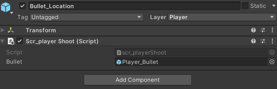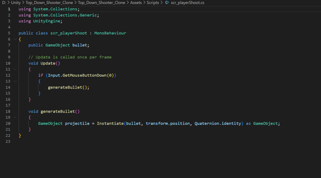 Then, I created another c# script that I placed on the bullet location child object created earlier. In this script, the variable is referencing a game object that is in the game, which in this case is the bullet/knife sprite that I just created earlier on. The void update function has an if statement which asks whether the player has clicked the left mouse button. If the player has clicked the left mouse button, then the bullet/knife that I created earlier will be fired. The generate bullet function is basically referencing the bullet so that the game can spawn it into the scene as soon as the function is triggered in the direction that the reticule is located, which is also referenced in the player bullet script that I just talked about earlier.