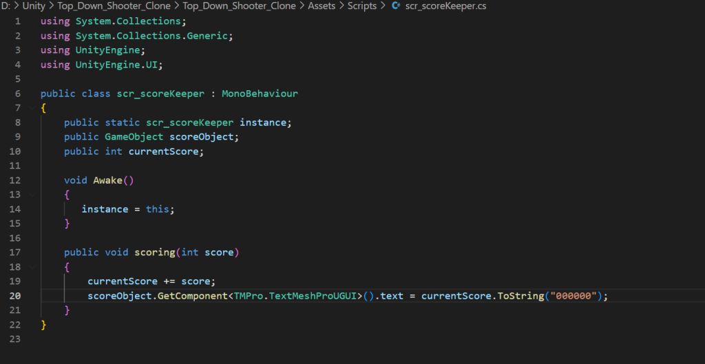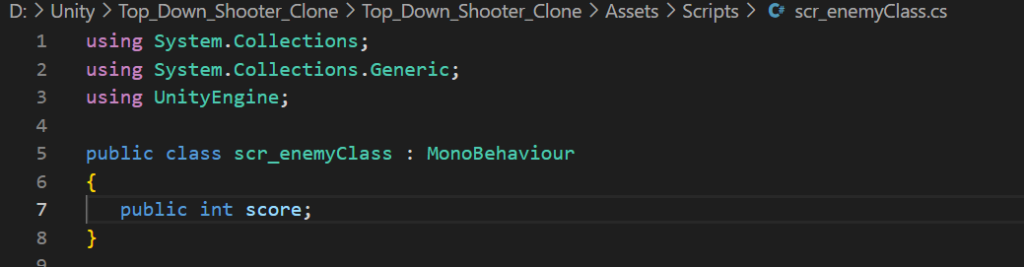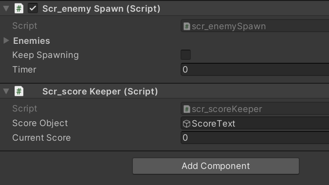 After sorting that out, I created another c# script (called score keeper) and attached it to the game controller inspector as seen above. Like seen below, this script has some similar variables to the ones that I used in other scripts beforehand. “Public static scr_scoreKeeper” instance acts exactly the same as the other public static variable in the enemy spawn script, the only difference is that it references this script instead of the enemy spawn script. “Public GameObject scoreObject” also acts exactly the same ass other public game object variables, with the only difference being that it will search for the text that I have just made instead of enemy sprites. “Public int currentScore” will be the variable that will help change the score and also keep track of it. The void awake function in this script will work exactly the same as the void awake function in the enemy spawn script, in that it allows the script to be referenced by other scripts (like the enemy collision script I described earlier). The “public void scoring (int score)” basically references another script that I have made alongside this script (shown just below the score keeper script), which is called enemy class. The only thing that the enemy class script does here is set an amount of score for each individual enemy and I have attached that enemy class script to all my enemy types so that I can get different scores for killing different enemies. The public void scoring function in the score keeper script also allows me to get the text object so that it will be changed as soon as an enemy gets killed. The code in line 4 acts the same way as the line 4 code for all UI elements in the peach clicker game that I talked about earlier, it basically allows this script to identify that it is working for a UI element rather than a normal game object.