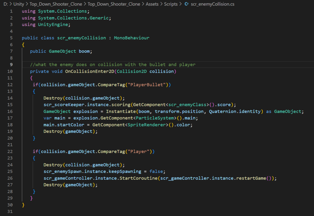 Then, after making that script, I made a new c# script that is similar to the player collision script that I have mentioned earlier with a few key differences. The most striking difference is that this script is longer than the player collision script, and that is because the enemy would collide with both the player and the player bullet. Once the enemy collides with a game object tagged “PlayerBullet”(which in this case would be the player’s bullet), the enemy destroys both the player bullet and itself, while also activating the explosion game object like I explained earlier. It also activates a function from another script called score keeper (which I will talk about later on) which will get the enemy class scrip (I will also talk about that later on) As for once the bullet has collided with a game object tagged “Player” (which in this case, would be the player sprite), the enemy will destroy itself and the player, but this time it will also set keep spawning from the enemy spawn script to false, since I would not want the enemies to spawn after the player has died as it could lead to a potential crash otherwise. This part of the script also activates a function from a different script (using a coroutine) called game controller (which I will also be discussing later on).