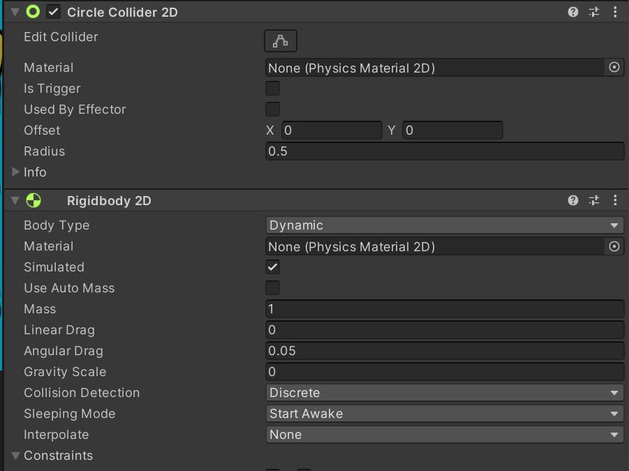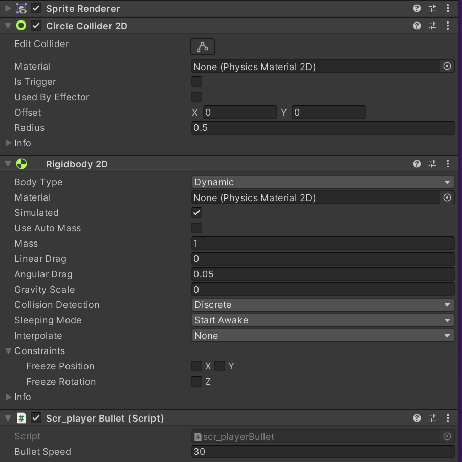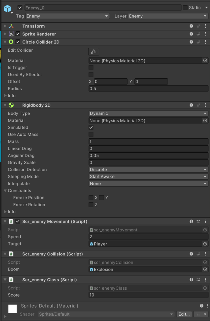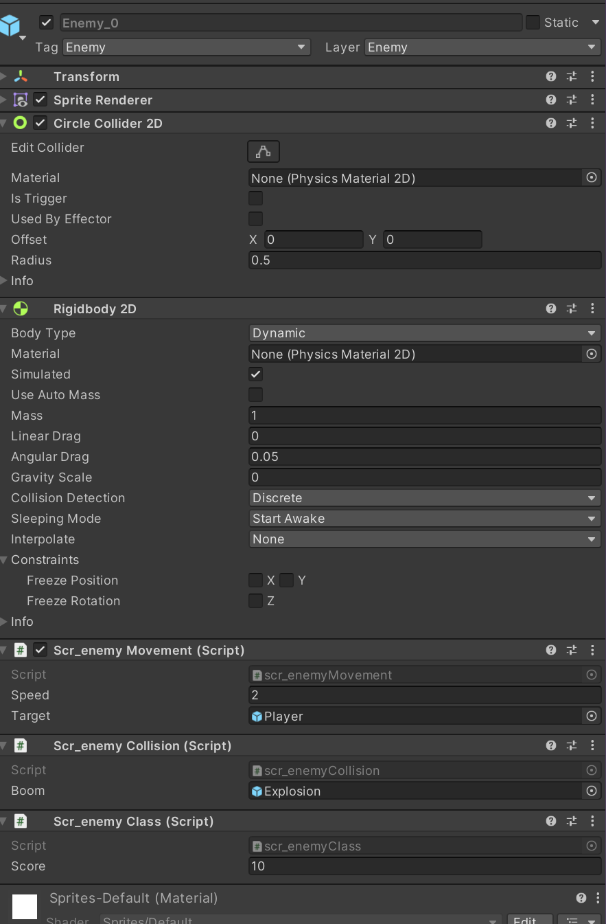 So, for the enemy sprites I added a circle collider 2D component and rigid body 2D component, like I did for the player and player bullet sprites, as I would want the enemies to collide with the player bullet and the player themselves for an interesting gameplay. I also made three different coloured enemies and put them into the prefabs folder in the assets window, like I have with the player and the player bullet, since I wanted some enemies to be faster than other enemies and possibly even have them shoot unlike the other enemies.