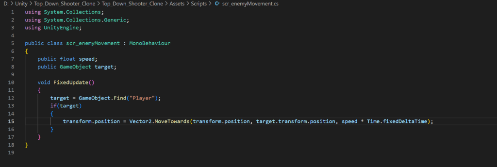 Following the creation of the enemy spawn script, I created a new script for the enemy and placed it into the inspector of all my enemy types. This time, it was a script for enemy movement since I needed an enemies that are capable of movement in my game. This script was simple to make as opposed to the last script. The only two variables that I needed were the public float speed and the public game object target variables. The public float speed variable has been discussed by me before on the player movement script and the scripts in my space invaders game, so I do not have to discuss it here. The game object target variable just refers to the player sprite. There is also only one function in this script, which is a void fixed update function. In this case, it finds the game object that has player as its tag (which in this case would be my player sprite) and if it finds the player, then the enemy would simply move towards it.