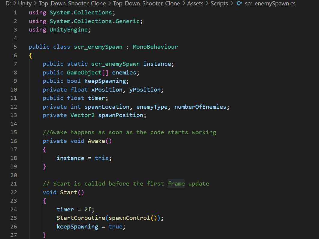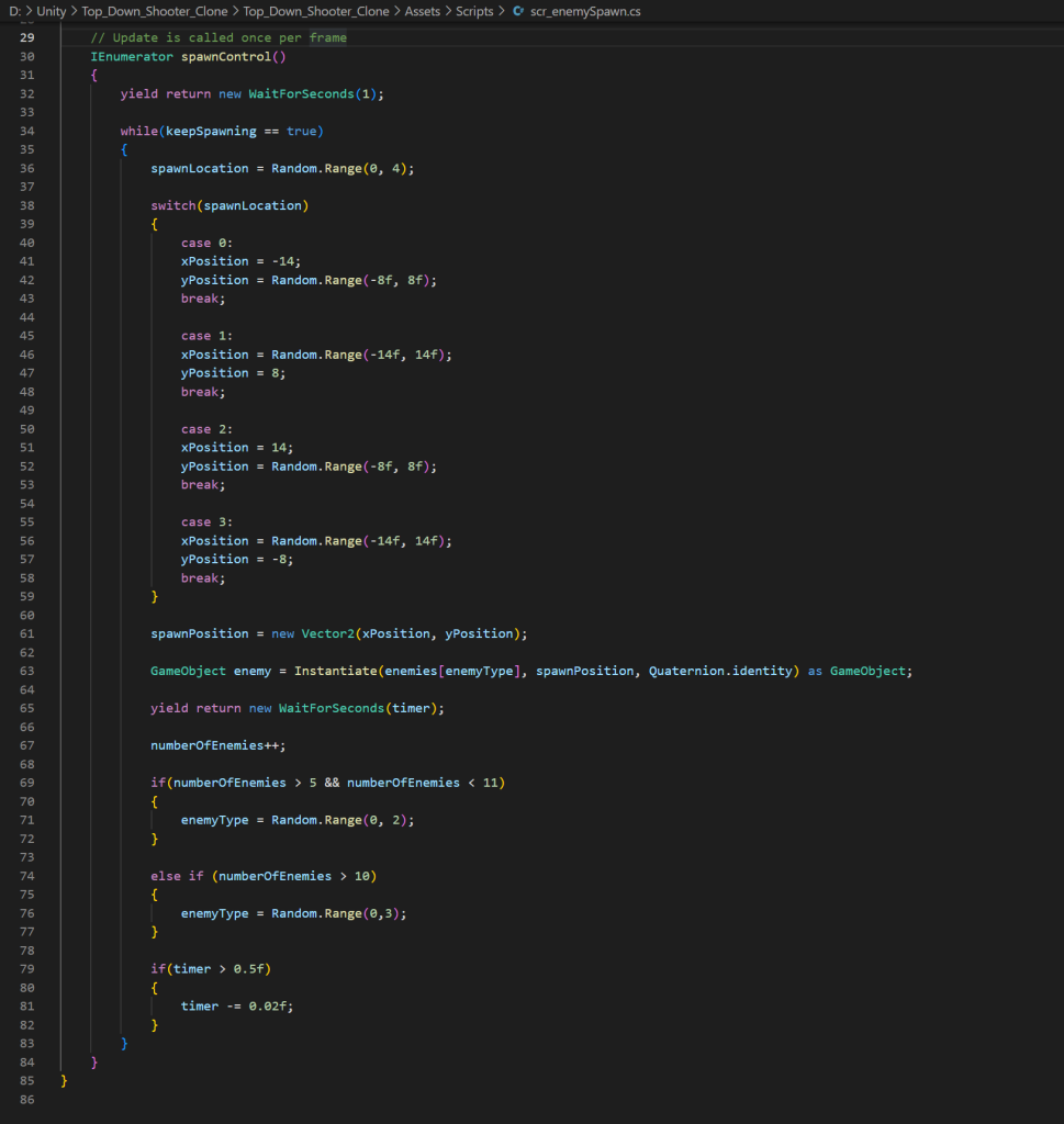 The private void awake function happens as soon as the code starts running in the game and in this case it tells the code in other scripts that this script is the one to look for. The void start function sets the timer in which the enemies spawn, in this case it would be 2 seconds like seen below on the left, the Boolean keepSpawning is also set as true since I want the enemies to keep spawning. The start coroutine line of code is also important as that would allow me to create an IEnumerator function, which in this case would be called “spawnControl” like seen on the bottom right. This function has two yield return new statements that are really important as the script waits for a certain amount of time before the script continues with carrying out its functions. If the keep spawning bool is true, the script will spawn the enemies at a random location along outside edges of the game screen, since it’s not ideal if the enemies spawn in the screen view or if the enemies spawn far away from the game screen. The break lines on the switch spawn location allows the code to spawn enemies one at a time rather than spawning multiple enemies at a time. The second half of the spawn control function basically allows the game to spawn different types of enemies depending on the amount of time that the player is still alive and the number of enemies that have already spawned. This part of the script refers to the float that has been given earlier (2f) and the game object variable that I discussed previously. The reason as to why I place square bracket near the game object variable is because it will allow me to reference multiple different enemy sprites apart from one, which is put into use later on with the enemy type variable being enclosed in the square brackets.