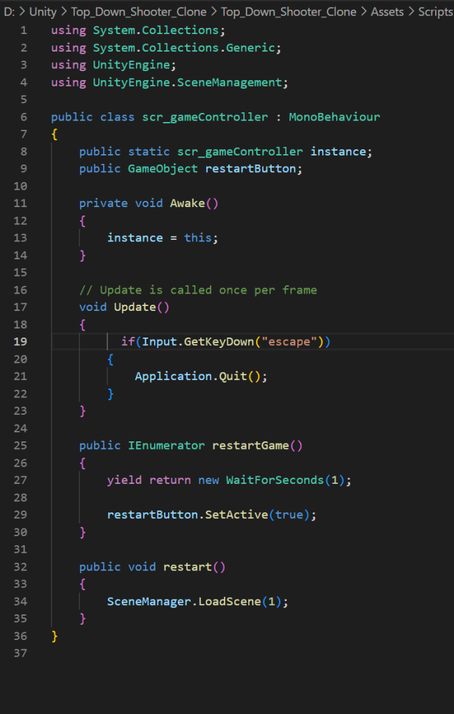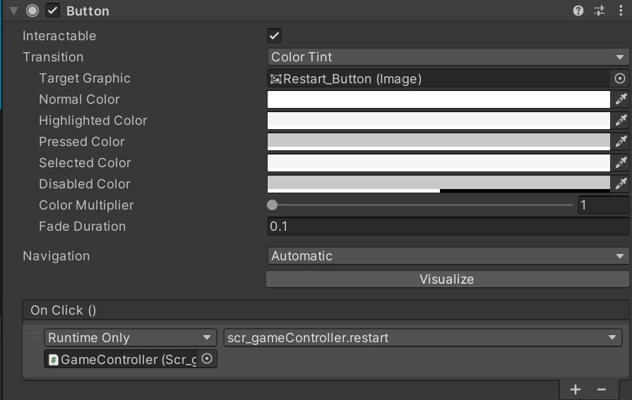 Then, I went on to create a c# script that I attached to the game controller object inspector mentioned earlier and called it game controller. The “public static scr_gameController instance” variable and “private void Awake” function work in the exact same way as the similar function and variable found in both enemy spawn and score keeper scripts, with the only difference being the script that is referenced. Same applies to “public GameObject restartButton” as all that does it allows us to reference the restart button object that I have created in the hierarchy window (which I made transparent as to avoid it blocking the view of the game). The void update function is basically what will allow the player to exit the game after pressing the esc button. The IEnumerator function builds upon the coroutine set earlier in the enemy collision script, and that will activate the restart button (as I deactivated it intentionally when making it). The public void restart function basically reloads the whole game scene (MainGame) so that the player could start playing again. (Screenshots of the script and game controller inspectors can be seen below). “Using UnityEngine.SceneManagement” is is important here as well as without it the main game will not be able to reload otherwise. I also attached the game controller script to the restart button inspector so that Unity knows when to activate the load scene function in the game controller script.