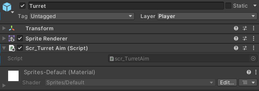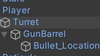 So I started to create the player by creating a new 2D square sprite and naming it “player” so I would remember what it is later on. Then, I created a child 2D circle sprite for the square object and named that the “Turret” and for that object I created another 2D sprite (this time being a square) and name that “GunBarrel”. The turret would be the object that rotates the gun barrel and the gun barrel would be where the next object would be located, which I called “Bullet_Location”. However, for the bullet location object I did not make that into a sprite and instead it was just and empty game object that was sat on the gun barrel. This can be seen in the image on the bottom left. I also created a reticule object for my game which is what I would use for an aim for the player by using their mouse. For the player object, I included a circle collider 2D and a rigidbody 2D as the player would need to collide with the enemy eventually.