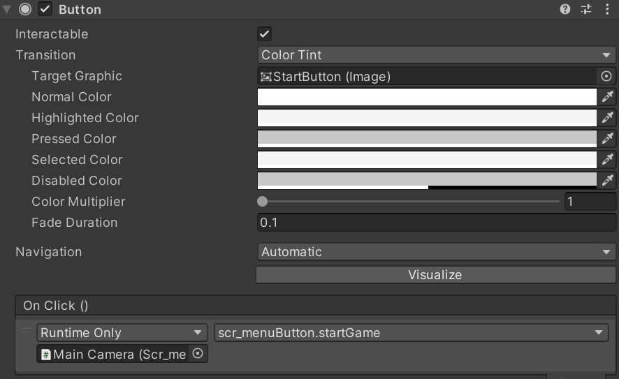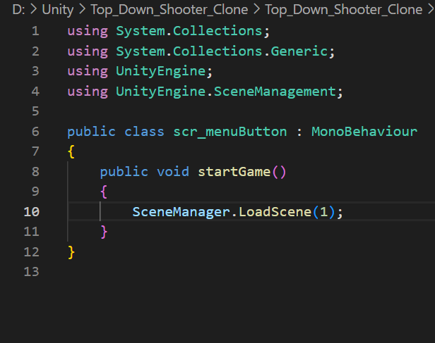 After I finished what I had to do in the main game, I saved everything that I adjusted in the main game scene and went to the start game scene. The first thing that I did was create a menu button that would be the same size as the game screen (like the restart button) and a few UI text objects. Following that, I made a new c# script that I attached to the menu button inspector and called it scr_menuButton. This script only has one function, which is called “void startGame”. This function acts like the restart game function I described earlier but it only activates when the menu button is clicked instead (both menu button inspector and script are shown below).