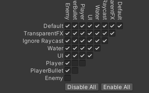 When I was making my character sprites working, I added layers to player, player bullet and enemy sprites. I then went to the project settings window, clicked on physics 2D and scrolled down to the right angled triangle with ticks all over it (seen just below). What this triangle does is it basically allows me to control what each object in the game can collide with and what objects it can not collide with. The ticked boxes signify that the object can collide with the other object and the unticked boxes signify that the object can not collide with the other object adjacent to it.