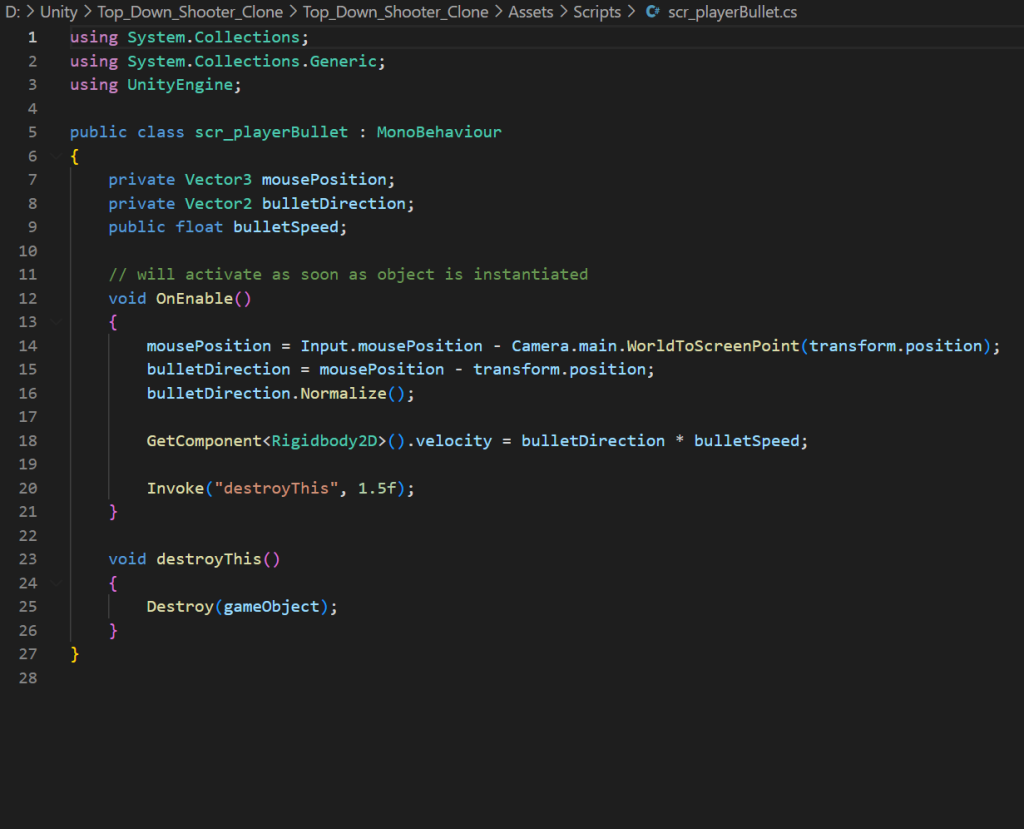 I added the player bullet sprite into my game and also added it to the prefabs folder I created in the assets tab, of course adding the rigidbody2D and collider 2D components afterwards. Then, I created another c# script with bullet speed, mouse position and bullet direction variables. The void enable function is a new function which will allow the bullet to carry out its functions as soon as it is fired/instantiated. what the function basically carries out in this is to get the rigidbody 2D component and change the velocity of the bullet (or in this case a knife) to equal the direction in which the bullet travels and the speed in which it does so. On line 16 of this script, we can see that there is a function that is called “Normalize”, which basically creates a string with the same textual value with the only difference being that its representation in binary is in the form of Unicode normalization. The invoke is basically calling out a method or a function, which in this case would be “destroyThis” which basically destroys the bullet after a certain amount of time (in this case it’s 1.5 seconds).