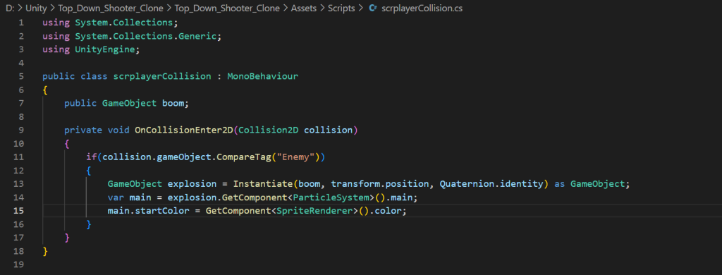 Once I finished with the other player scripts, I included the script below which will basically as soon as the player collides with the enemy sprite which I will talk about later on. The game object boom variable references the explosion that I have created previously (inspector of that object is seen just below the script). The on collision enter 2D function will activate that game object once the player has collided with the enemy, which is tagged as “Enemy” in my case. Other than that, there is not much to this, apart from the fact that it gets the components from the explosion game object and the player character so that the explosion will be the exact same colour as the colour which the player is set to.