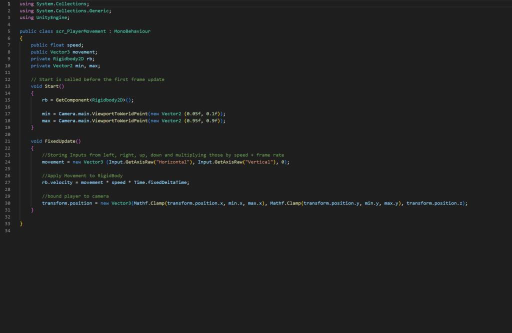 To start off I created a c# script for the players movement as I would want the player to be able to move. The script below will do a few things: to start off with, it will allow me to control the speed at which my player moves, search and get the rigidbody component that I have attached to the player object previously, it will make sure that the player moves up and down on the camera along only the x and y axis (since I do not want to include the z axis in this) and then apply the movement and speed to the rigidbody that I have on the player. The script will also keep the player bound to the camera from the values that I set on the script, which I already set in the bottom of the void start function. I attached the script onto the player character so that it would carry out this function on the player character. The script I used can be seen just below.