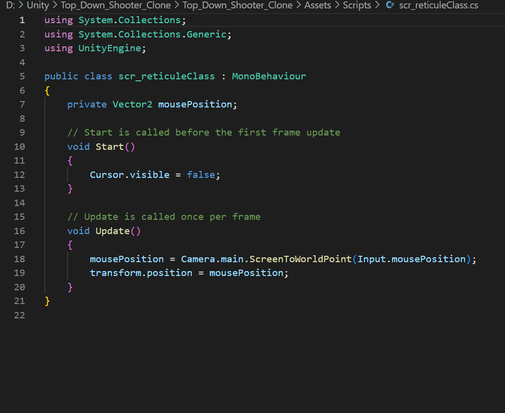 The script shown below is the script that I have attached to the reticule object that I have created in the hierarchy earlier. The variable in this script is referencing the position of the mouse cursor and the code in the void start function hides the cursor so that the reticule is shown instead. The code in the void update function will make the reticule move wherever the mouse cursor moves by following its position. Also, there is no collider component included in the reticule inspector as I would not want it to collide with other objects such as the player or the enemy.