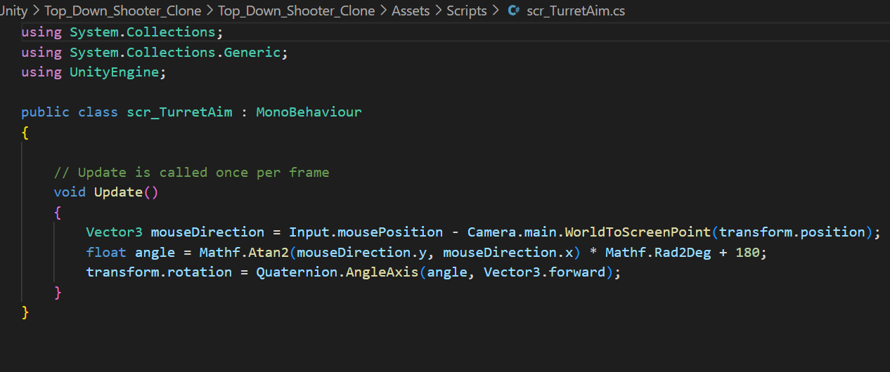 Then, I created a script for the turret aim, which I attached to the turret object that I created earlier. I only needed to include a void update function in this which would basically tell the turret (and any child objects attached to it) to face the direction in which the mouse is going in while staying in a single place. Float angle controls the angle at which the turret is facing the mouse, this is important as the turret has to face the cursor (or in this case the reticule) so that the bullet would hit it’s target. Script is shown below.