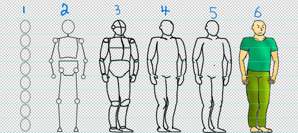 Firstly, I started off by creating a brand new photoshop document with a size of 1080 by 1920 pixels and made the background transparent. After that, I started by going to the edit tab and to preferences and chose grids and guides. I wanted to put guides on my project since I would need them to stack the heads and get the body proportion right. Then, I made my head and duplicated it until I got about 8 oval like heads and stacked them on top of each other. After I finished with the head stacking, I merged them into one layer, duplicated the newly merged later and moved it slightly so that I could carry on with the next stage of the anatomy drawing, for which I just basically drew out the places where all the body parts would be located (elbows, arms, hands, legs, knees, feet, hips, ect). I decided to make an adult male character for my drawing, so I also had to keep that into account when making my character so that I do not get their proportions wrong, Afterward, I drew out the basic outlines of all the muscles and structures in the body, including the biceps, quadriceps, triceps, hamstrings, gluteals, pectorals, deltoid and gastrocnemius muscles (2). In the next two stages, I was refining the character a bit more to clear any editing lines and just to refine some of the physical attributes of the character, such as the elbows, ears and knees. For the final stage of my drawing, I just added facial features (eyes, eyebrows, mouth and nose) onto the character’s face, added fingers to their hands and of course added some accessories and colour to it as well.