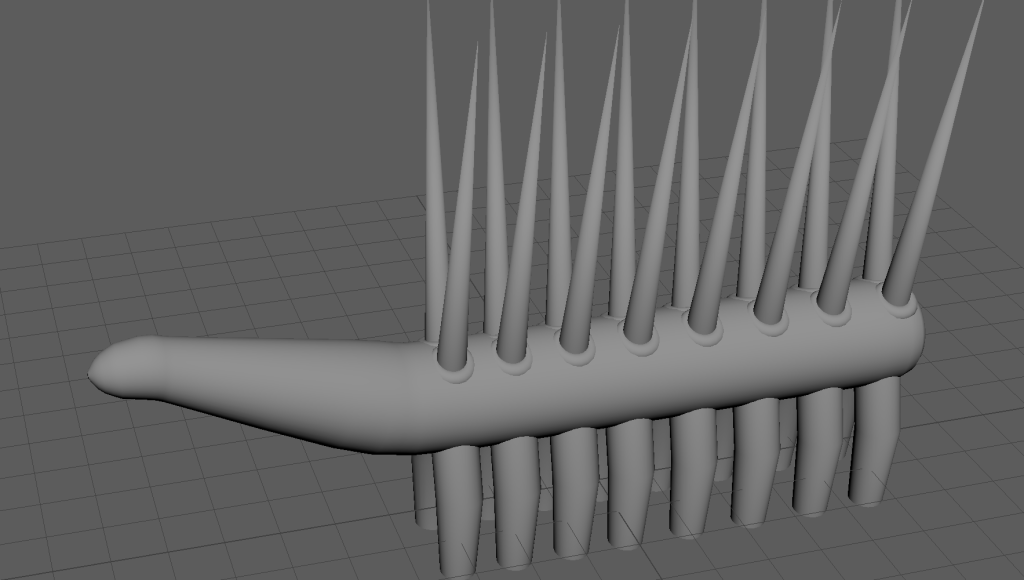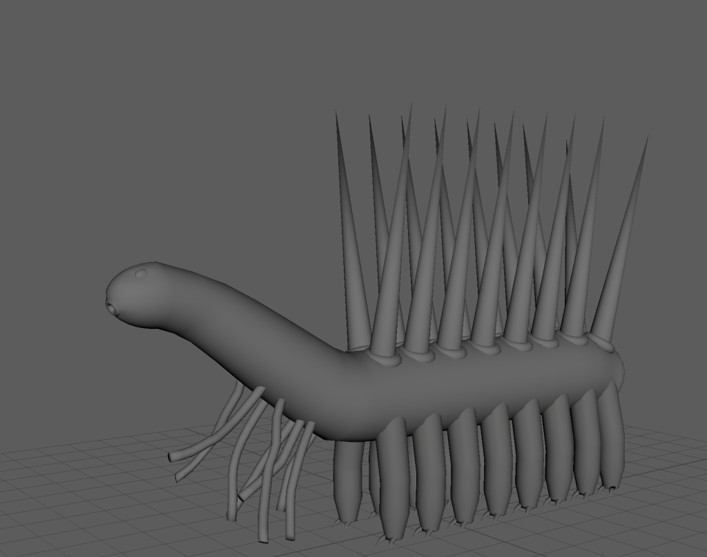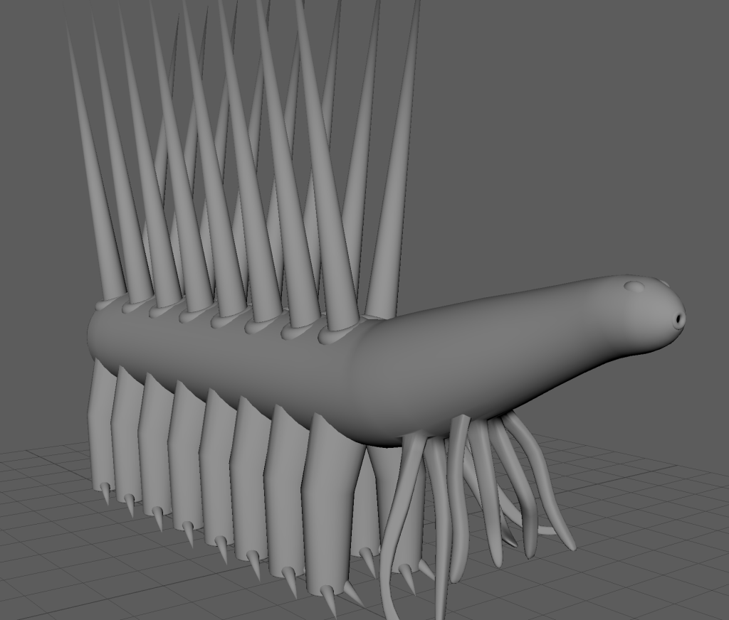 I started this project off by creating a cylinder and adjusted its scale, position and rotation. After that, I selected the faces making up one of the circles and extruded them outwards, adjusting their size as I was doing so, rotated them and extruded them out in a different angle. I kept doing that until I got a shape that more closely resembles that of a Hallucigenia’s main body structure. there was one problem with this process, and that is the fact that the edges where I changed the direction of which I wanted to extrude my faces were too straight. Despite this issue, I was able to easily repair it with the help of the smooth tool, at the cost of having ngons, which I could easily deal with by using the target weld tool as I mentioned earlier.