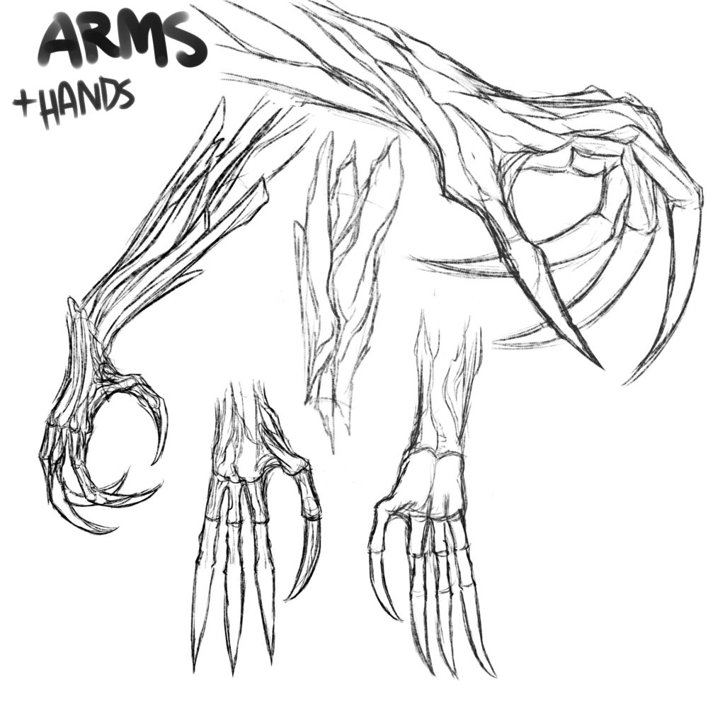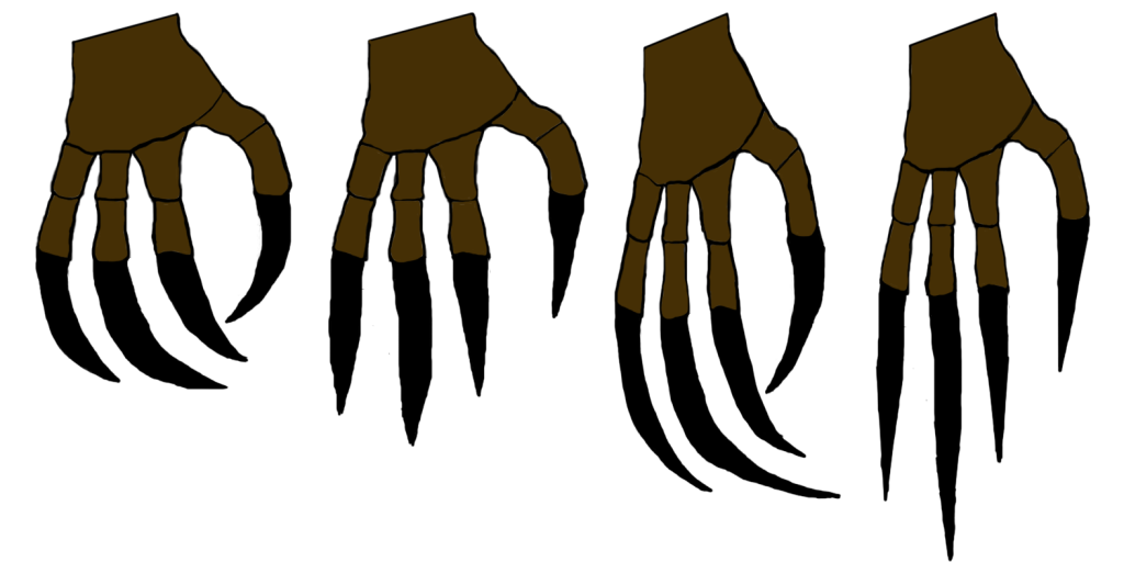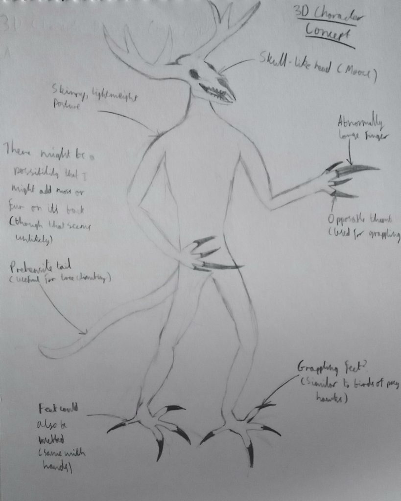 Eventually, I decided to make the primary base of my character a Wendigo, as I liked the idea of it more than the other creatures I mentioned earlier, I took some features from some of my other inspirations such as the Leshen and the rakes and adapted them in a Wendigo format. I experimented with a bunch of different antler shapes and sizes and did a bunch of research on animal claw anatomy (more specifically eagle claw anatomy). From the information I gathered, most animal claws are curved so that was something that I had to bear in mind whilst making an initial concept for my character, especially when designing the foot claws as eagle claws are noticeably more curved than other animal claws. The tail on the character is mainly inspired by different species of monkeys and other similar primates, like the Mexican Spider Monkey, which uses its tail to hang on and grapple on trees.