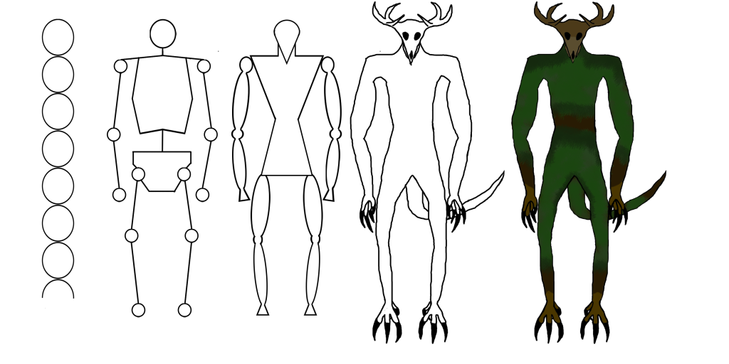 With all the above aspects considered, I decided to make an anatomy sketch of the character on how I wanted it to look like. I drew it in this pose as it seemed more imposing and menacing, almost as if it stared down at the viewer which is what I want to convey, especially with it’s posture and unusually skinny shape to it.