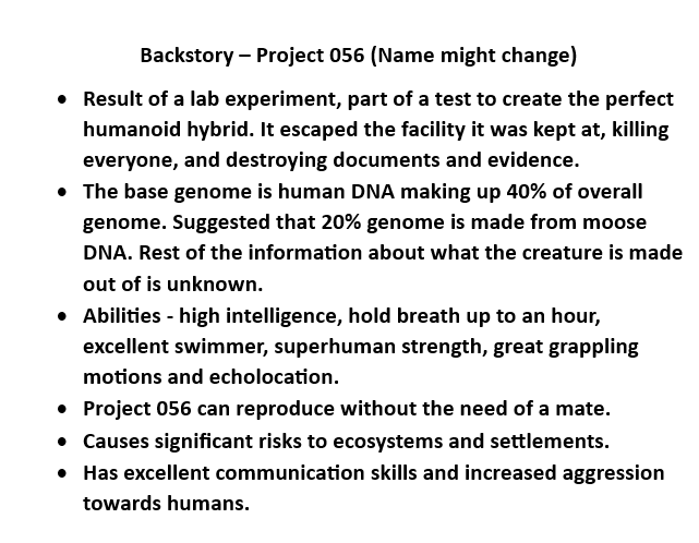 The image just below this text contains the backstory that I have created for my character, which includes its name, origin, possible abilities, and basic facts. I wanted to have an element of science fiction to my character by adding how it was created as to show that it was created by humans and not a product of nature, so therefore I decided that my character would fill a role of an invasive species (like in the case of Vita Carnis). Invasive species are defined as species that are not supposed to be in the environment that they reside in, whilst also having a direct effect on the surrounding environment (like seen in the backstory page) (National Geographic, 2022). In the backstory, I also did not mention that the main diet of my character is humans, but it can eat any living matter as it’s got an advanced immune system to tackle any foreign substances. Green can have a positive meaning, as it is normally associated with nature and growth, but it can also convey the message of a lack of experience and also feelings of envy and jealousy, hence the reason why I chose said colour for my character (Chapman, 2010). This links to the story of my character in a sense that it despised its creators and wanted to escape it’s confinement, along with the creature’s age due to the moss growths that have spread across its body.