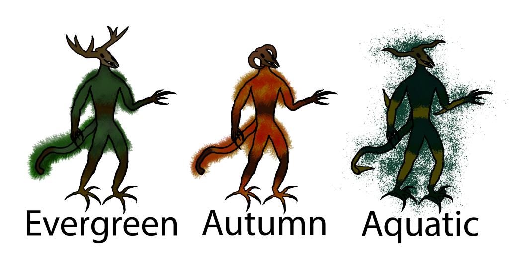 As seen below, I also decided to explore with different shades of colour such as the mixture of blues, greens, and yellows to create the aquatic variant and autumn colours (red, yellow, orange, and brown) for another variant. Ultimately, I decided to expand on the third variant, which I called the Evergreen variant, which uses a colour palette of mainly greens and browns, just like the colour scheme that’s present in evergreen forests. The evergreen variant of the character design was better due to it having a more darker unsettling colour scheme, which conveys the creepiness of the design more, as characters with darker colour schemes tend to be creepier than characters that are very bright and colourful.