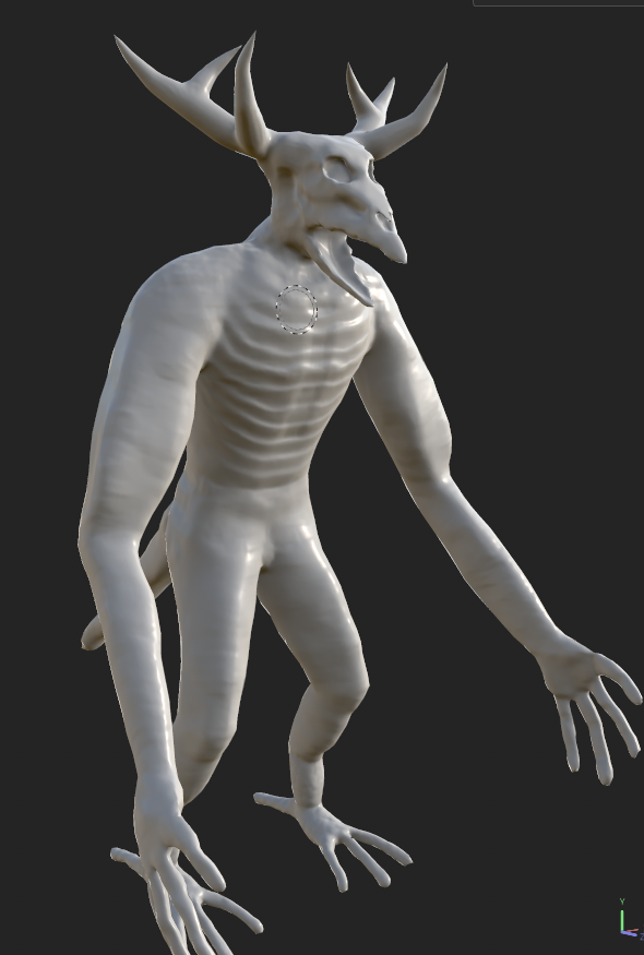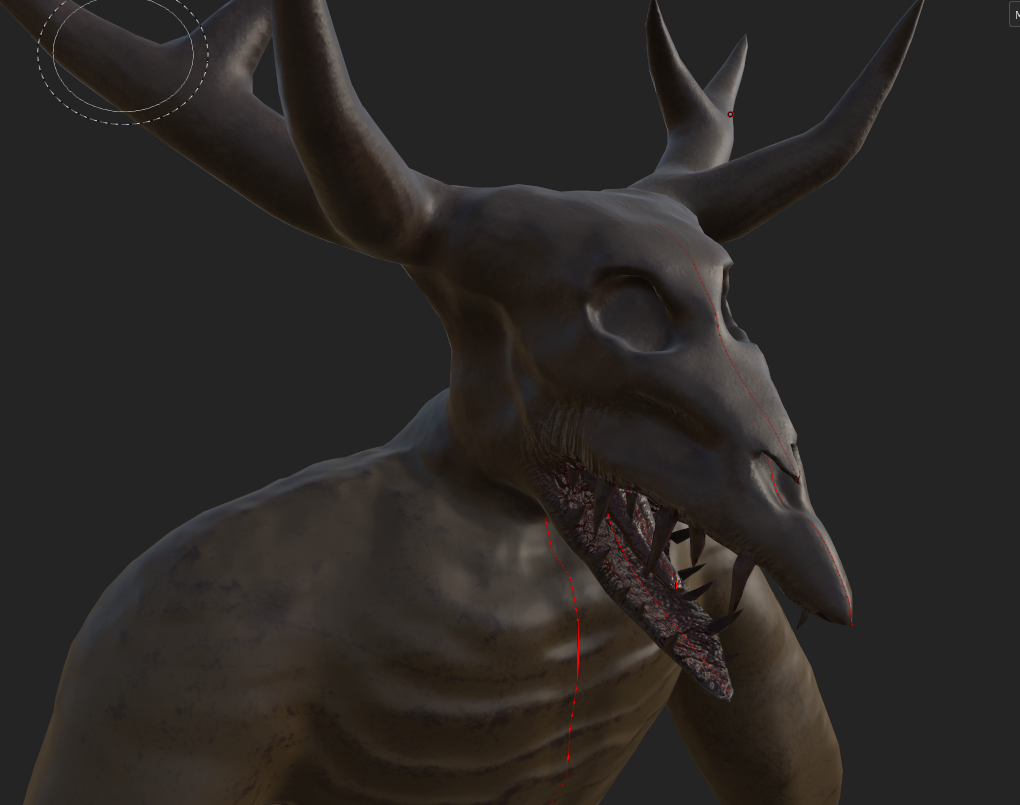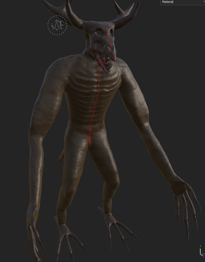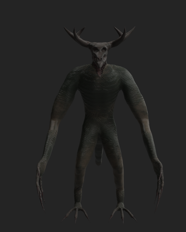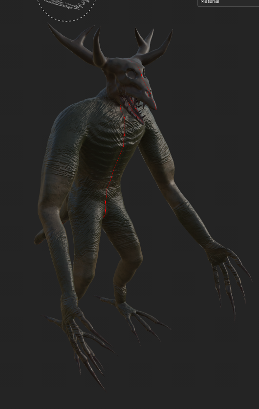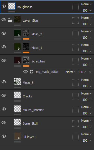 For the main body, I started the texturing by firstly creating the base colour and roughness of the asset, with the fill layer being a brown colour since I wanted to match the colours of the reference image for my character that I made earlier. Afterwards, I added crack details on the skin as seen below, whilst also painting the mouth with a brush that I set with the flesh material to get a similar colour to the tongue. Since the skull was the same colour as the rest of the body, I had to paint on the head with a brush that had the bone material attached to it, whilst I also made sure to adjust the colours according to the design of the character. When I finished doing that, I decided to create a masked layer that contained scratches and dirt to add more skin details to the character and make it look more alive.