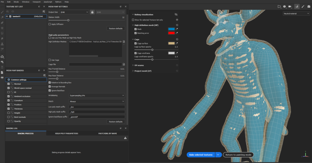 After the substance painter project set up, I went to the baking section to bake in the details from the high poly mesh onto the current low poly mesh, and set the details as seen below, making sure that I have the correct high poly mesh to bake into the low poly mesh. Baking is a process that involves transferring surface data from one 3D model to another 3D model, this method is utilised as it can transfer details of a higher poly mesh to a lower poly mesh whilst keeping the poly count of the affected mesh the same (Conway, 2021). As seen below, the only mesh maps from the high poly map that I transferred were the normal, world space normal, ambient occlusion, curvature, position, and thickness, with the rest being unselected as I did not need them. After that I baked in the selected mesh maps and returned to the main viewport, with the result being ideal.