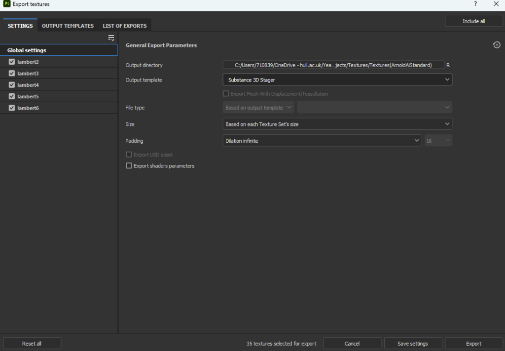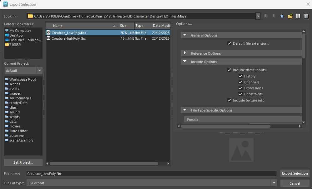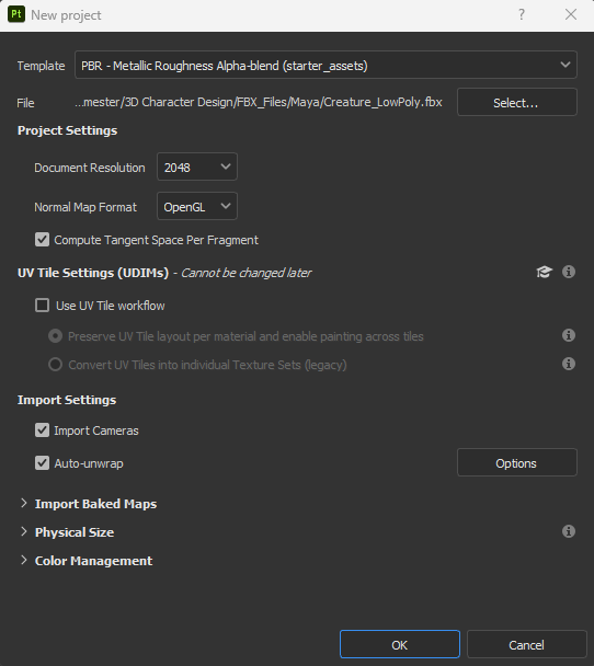 Before I could begin texturing, I had to export both the high poly (asset exported from zbrush earlier) and low poly (retopologised asset) as fbx files from maya, so I selected both separately and exported them as separate files as seen below. In substance painter, I set up the file as the low poly asset since I will be baking the details of the high poly asset onto the low poly asset. I set the template to “PBR -Metallic Roughness”, the document resolution to 2048, the normal map format as “OpenGL”, and ticked the compare tangent per space fragment option before clicking ok to create the project.