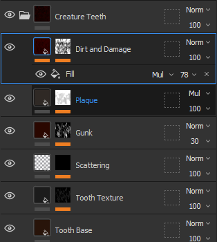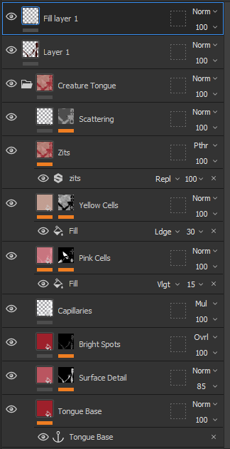 I started off the texture process with the teeth, claws, and tongue. The teeth and claws have the exact same material attached to them, with the base material being a smart material called “creature teeth”, with adjustments that I wanted to make so that it would fit more with the colour scheme of the asset. After that, I textured the tongue, with the base being the creature tongue smart material, with me adjusting the zits and scattering a bit, but I also included a paint layer, which I put the flesh material into so that I would slightly adjust the texture, colour and height of the tongue accordingly, which ended up making the tongue look fleshy and more horror-like. However, I do think that I should have started the teeth and tongue from scratch rather than using already existing templates that are available in substance painter, which I ended up considering when I went to texture the rest of the body later.