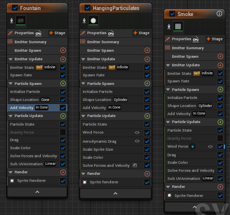 For making the fire, I created three separate particle emitters, with two of them being fountain emitters for the fire and smoke and one being the hanging particulates emitter for the sparks that happen when the fire is burning. I started off by changing the lifetime of the particles so that they would make the emitters look more like fire and smoke, with fire having a shorter lifespan than smoke. Like seen below, I turned off the gravity force for both fountain emitters as fire and smoke are not effected by gravity, I also decreased the velocity speed of both the fountain emitters (in the add velocity option) so that the emitters would more accurately depict the movements of fire and smoke (I made the velocity speed slower in the smoke fountain emitter, as smoke usually travels slower than fire), I also increased the cone angle (how spaced out the particles are within the cone) of both the fire and smoke fountain emitters so that the particles are less concentrated as before. Then I set the sprite for both fountain emitters to the fire and smoke sprites respectively, which made them look more like smoke and fire. Because of this, the visual effect was too small to see, so I had significantly increased the sprite size for both the fountain emitters so that they would be visible. Before I continued, I also changed the colours of both fountain emitters so they are like the colour of the sprites, and I set the sub-UV animation to linear. To finish of the fountain emitters, I repositioned the smoke fountain emitter so that it would be just above the fire rather than inside the fire or way above the fire.