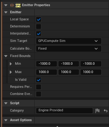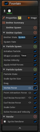 The last effect that I have made using the Niagara system was a portal effect using a fountain emitter. In the emitter panel, I firstly adjusted the emitter properties so that sim target would be GPU compute sim and the fixed bounds would be set from minimum -1000 and maximum 1000 on all axis. I also changed the emitter state scalability life cycle mode to system so that the particles would disappear according to their lifetime and the spawn rate of the particles so that more particles would spawn from this emitter. I also removed the add velocity and gravity force from the emitter as the particles will not move upwards, neither they will be affected by gravity as a result.