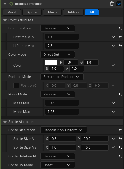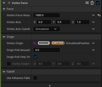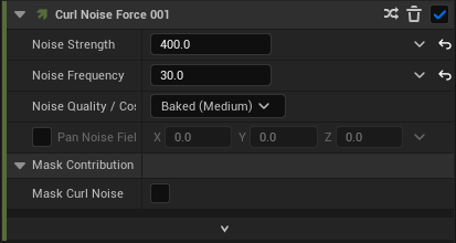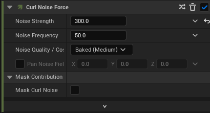 Next, I added a scale sprite size so that the visual effect increase and then decrease in size and also added two curl noise forces with different values for the noise strength and noise frequency as seen below. Curl noise forces create this curl like effect in the visual effect, which initially shoots the particles up all over the place, so to stop that I increased the drag significantly (to about 15) to make it more visually appealing.