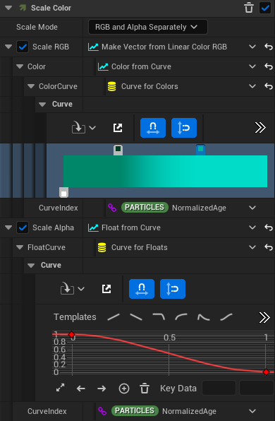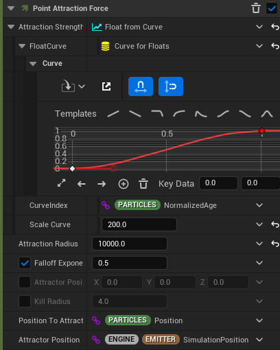 Afterwards, I created a point attraction force to attract the inner portion of the torus shape and added a float curve which gradually increases. I also changed the scale curve to 200 and attraction radius to 10,000 in order to make it look more like a portal than it had previously. The next part of making the portal was to add colour to the particle through the scale colour option. As seen below, I decided to make a linear colour curve so that the colour of the portal would change brighter over time. The final part of making the portal visual effect was to create a vortex force so that the particles would look as though they are part of a vortex, and changing the vortex amount to 1000 to make it more noticeable in the final visual effect.