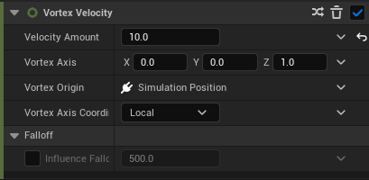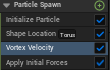 In the particle spawn section of of the emitter, I added a vortex velocity option so that the particles could rotate in a vortex. I set the vortex amount to 10 and set the vortex z axis to 1, with the vortex axis coordinate being set to local as seen below.