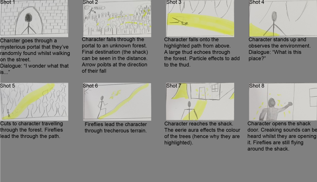 Like mentioned earlier, I originally decided to make a walking sequence where a character would follow a bright yellow path to the shack, but I scrapped that idea after I made the storyboard for it as I did not have any inspiration at all when making it, and without a clear goal in mind. This is when I came up with the idea of creating a video game opening, with the main inspiration behind this choice being the Monster Hunter 4 Ultimate opening that I happened to stumble across whilst trying to think of some ideas. I wanted to make the video a showcase of the environment I created for a level that I was supposed to make, where the video shows some important locations that are present in the environment itself.