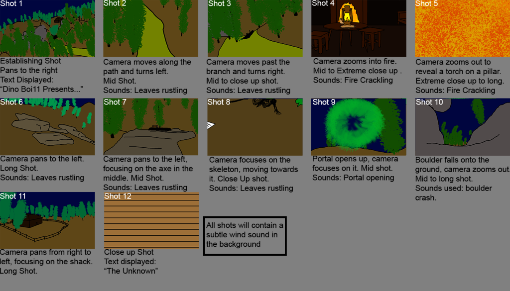 As you can see below, this is the storyboard that I ended up referencing when making my video sequence, it describes what I will be including in the scene, as well as any sounds that I might include. I have tried to keep to professional standards whilst doing this, but I forgot to mention some visual effects and transitions that I will be using. In shots 2 and 3, there will be leaves falling on the ground and in shot 11 there will be fireflies flying around the area. All shots will have a fade to black transition between them, with extra effects to enhance the overall feel of the piece (like a vignette during some of the shots). For the visual effects, I mostly want them to be believable in the environment that I decided to make them in (a forest), hence why I will not be adding many elements of magic in this production whilst keeping a component of mystery (this is why I decided to add a portal effect in this video sequence).