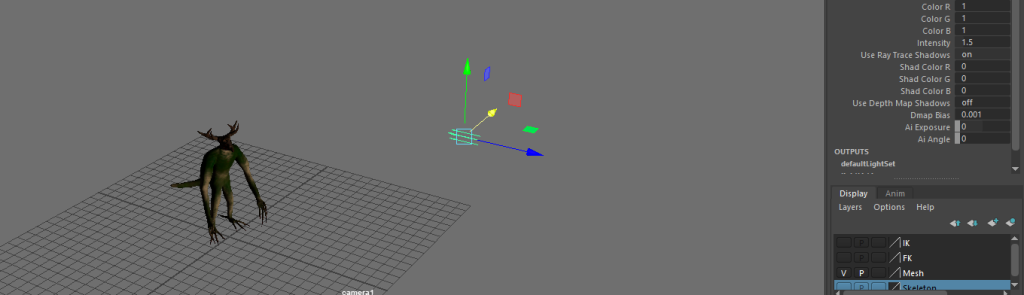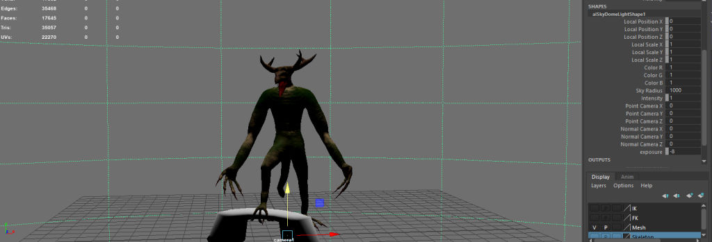 After keyframing all the poses I wanted, it was time for me to render the animation. As I mentioned earlier, I was required to make a source images folder in which I placed all textures I used on the model. At first I did not connect the textures in the source images folder to the mesh so the first time I rendered the animations they did not have textures (and still might not have due to the textured renders not being sent through). The reason as to why I needed to do this, and also create the folders is because I am using the viper renderer which is a maya plugin that will create images of the animation and send the video through after a set amount of time. Before I rendered out the animations, I created the lighting and set up cameras on the animations, making sure that the cameras are also keyframed to create unique shots. I used a variety of lighting, including the sky dome lights (cover the entire scene in light), point lights (cover a selected spherical area in light) spot lights (lights up an area in a cone shape) and directional lights (act like sunlight). All of those lights can have adjusted exposure and lighting through the